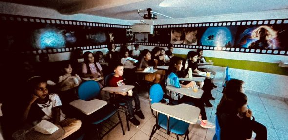 Os alunos assistiram a um filme, se divertiram muito e também praticaram o inglês ao pedir os ingressos, a pipoca e as bebidas. Foi uma experiência enriquecedora para todos.