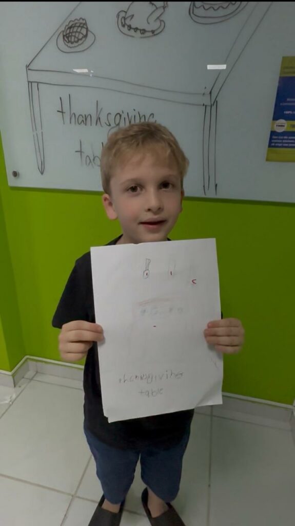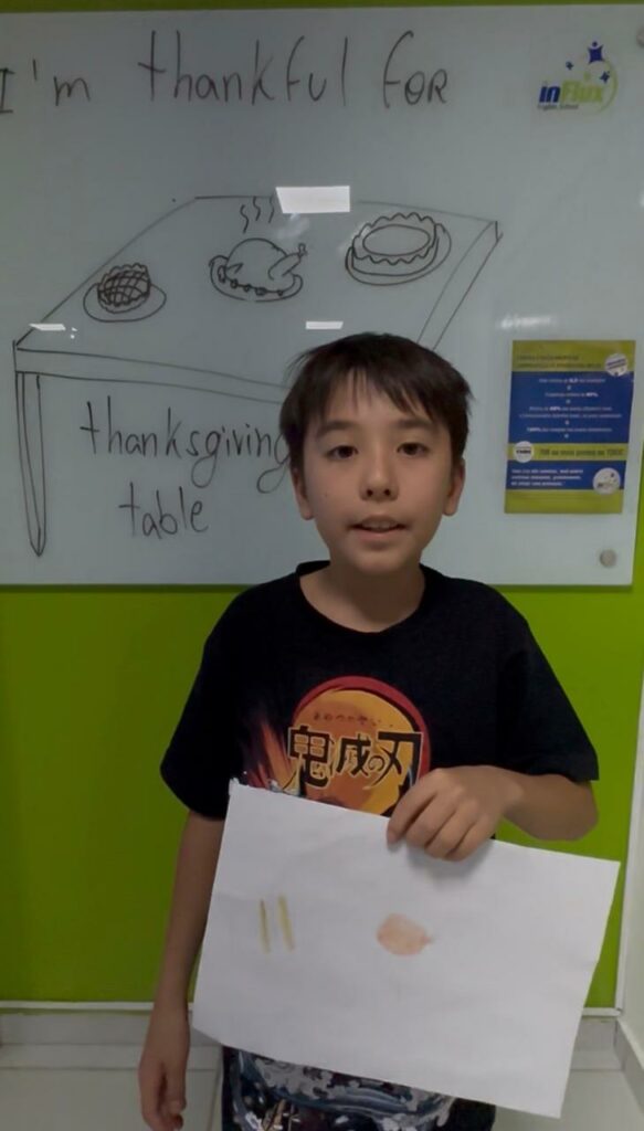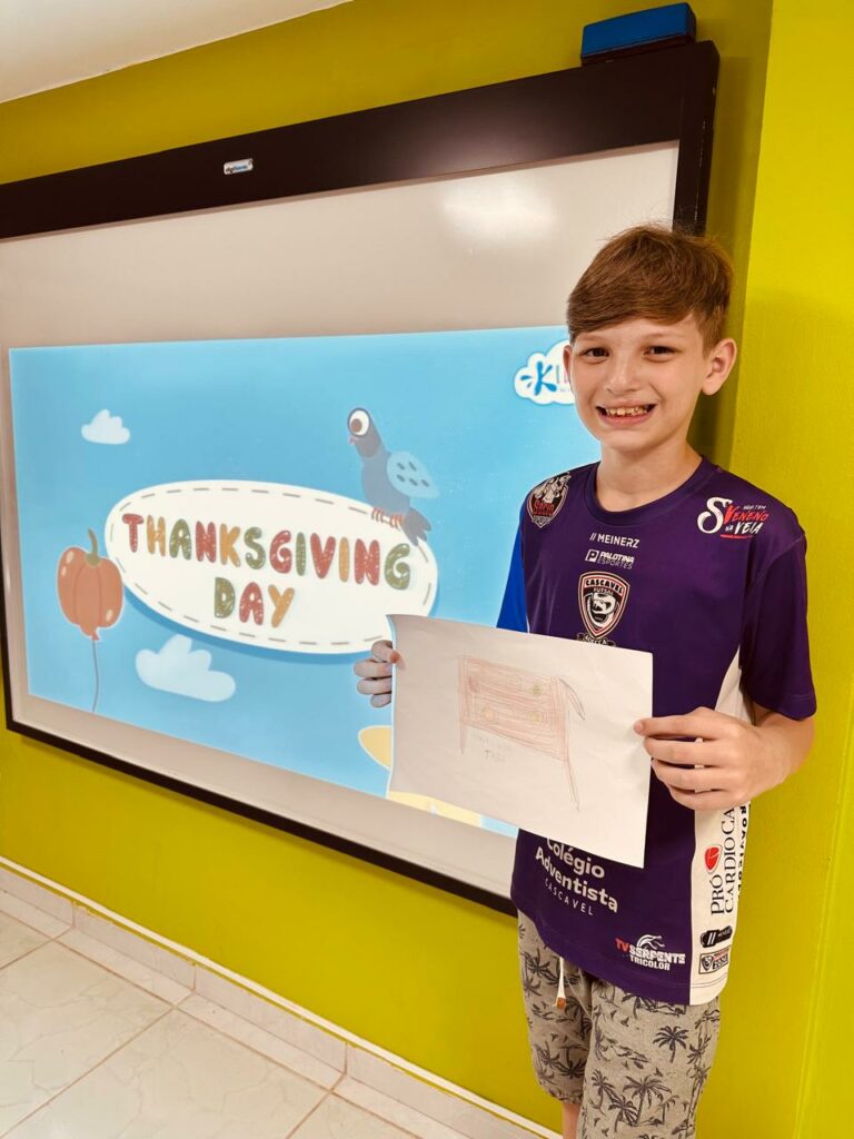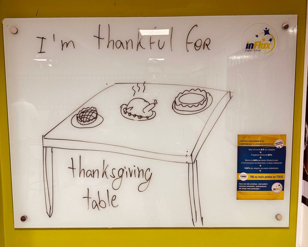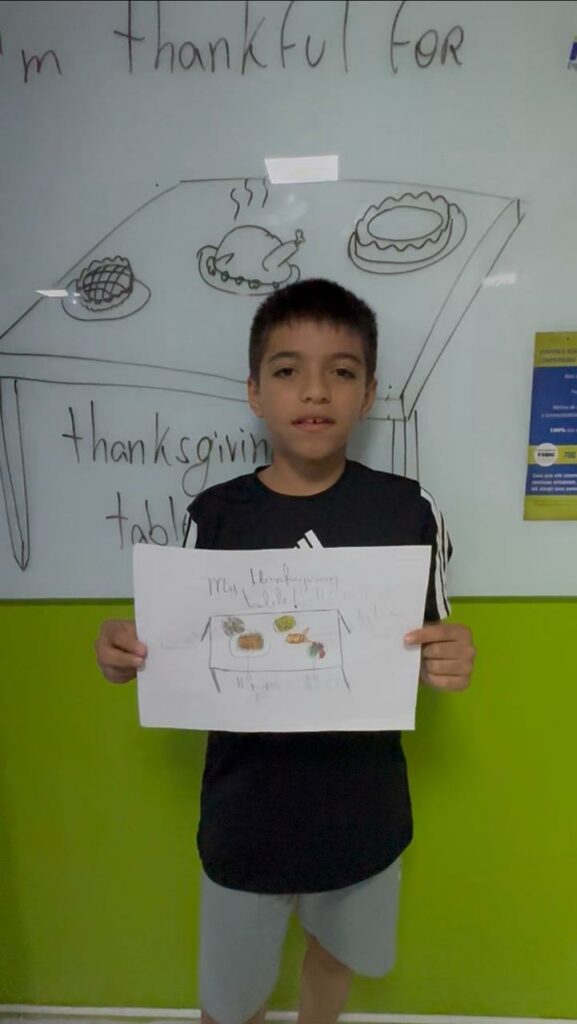 Os alunos participaram de momentos de conversação, explorando a origem do feriado e utilizando o chunk “I’m thankful for…” para expressar gratidão em inglês.