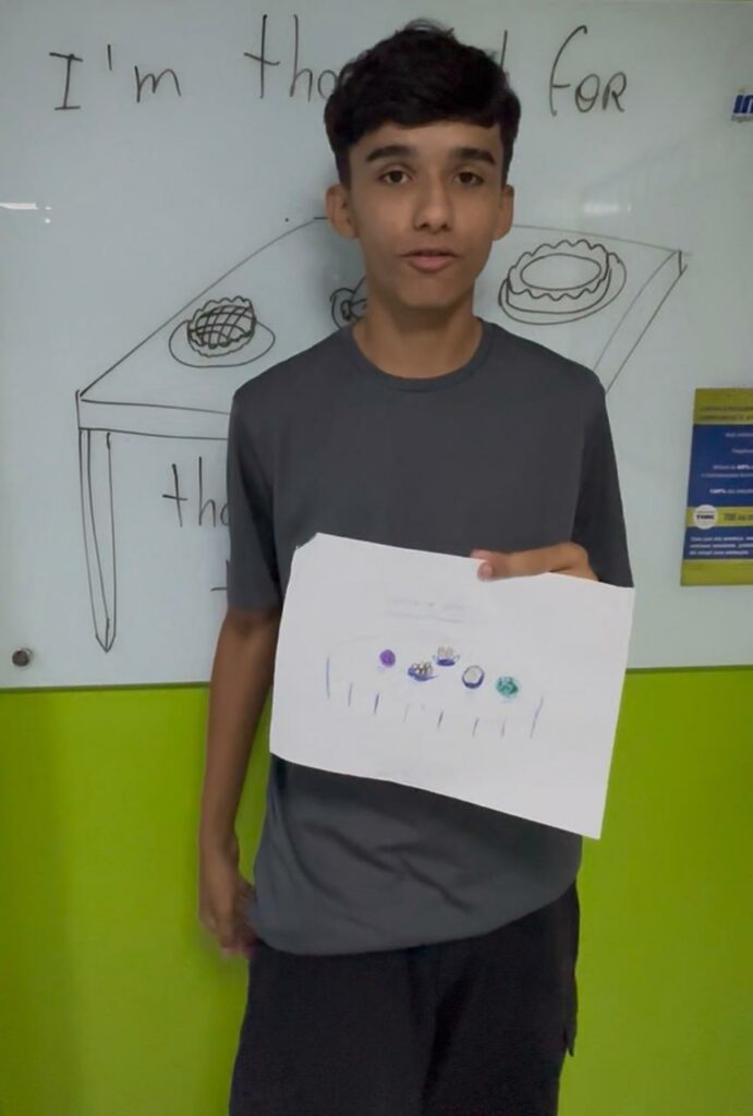As turmas exercitaram a criatividade ao desenhar seus próprios pratos típicos e simular um jantar de Ação de Graças, colocando em prática vocabulário relacionado a alimentos e itens de mesa.