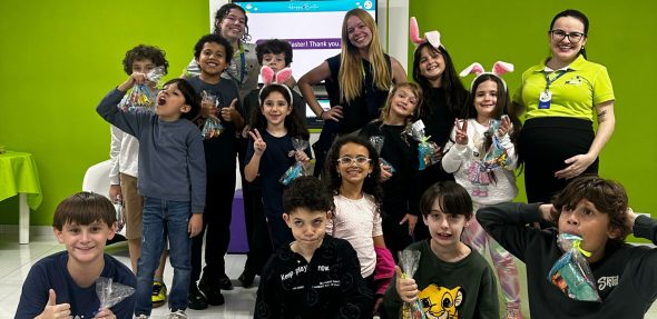 A atividade começou com uma roda animada, onde as crianças aprenderam novos chunks relacionados à Páscoa. Em seguida, encararam os 8 desafios da missão pascoal — tarefas como oink like a pig, hop like a bunny e give a high five to a friend estimularam o uso do idioma por meio de movimentos e criatividade.
