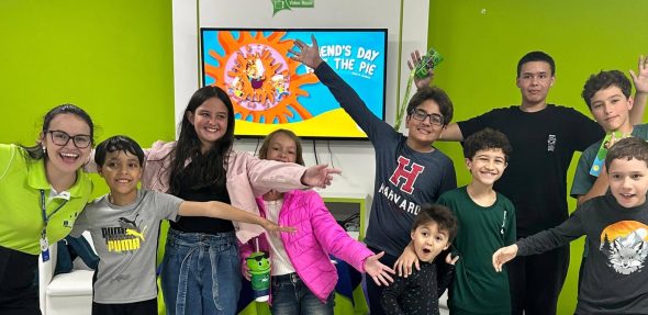 Na Atividade Extra Face the Pie, os alunos Kids e Juniors praticaram inglês por meio de uma competição de perguntas e respostas. A dinâmica consistia em pontuar a cada acerto e, em caso de erro, receber uma torta na cara.