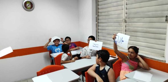 Além de conhecerem mais sobre as tradições desta celebração, como o famoso jantar de Ação de Graças e os símbolos associados, os alunos também treinaram vocabulário específico relacionado à data. Com o apoio dos professores, eles aprenderam e praticaram termos em inglês ligados ao Thanksgiving, como “turkey” (peru), “pumpkin pie” (torta de abóbora) e “harvest” (colheita). Isso junto ao “What would you do?” com situações inesperadas na data, e também um jogo de adivinhar quais itens ou contextos eram mais frequentes na festa.