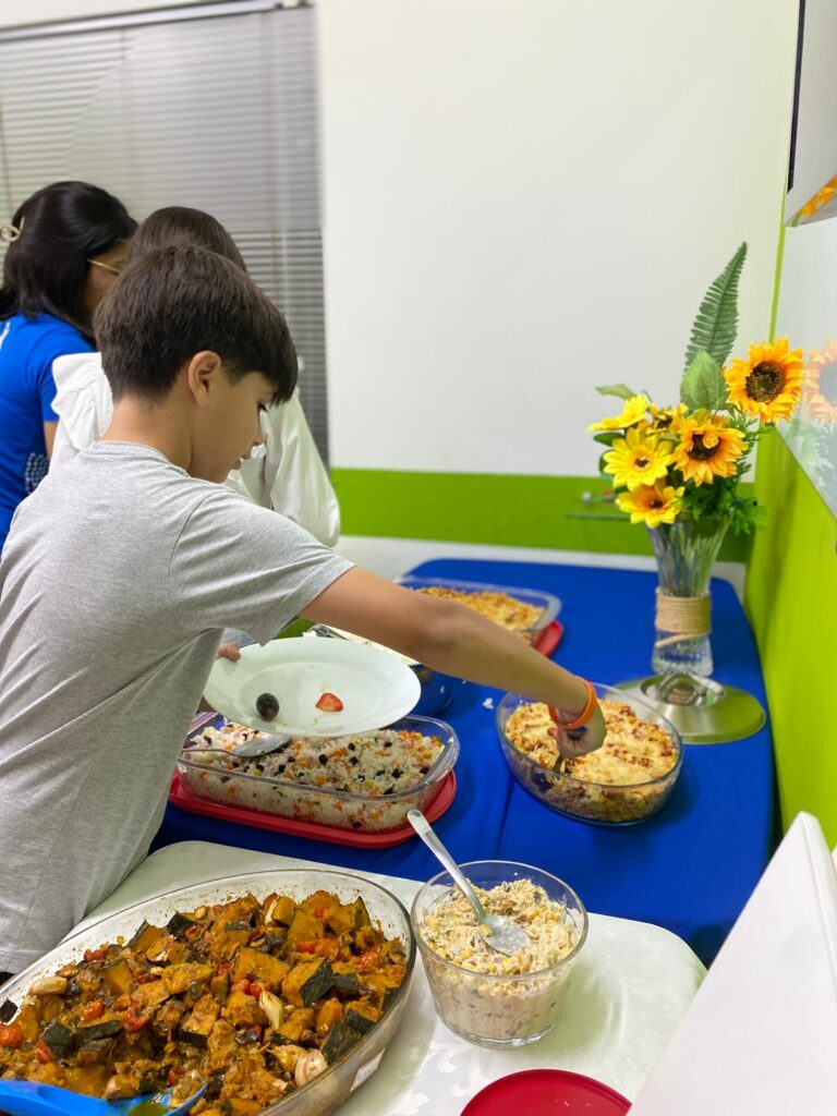 A ceia foi colaborativa: cada aluno levou um prato para compor a mesa, seguindo a tradição típica de muitas famílias dos Estados Unidos durante o Thanksgiving. A variedade de pratos trouxe diversidade e autenticidade ao jantar, permitindo que todos contribuíssem para a experiência.