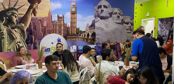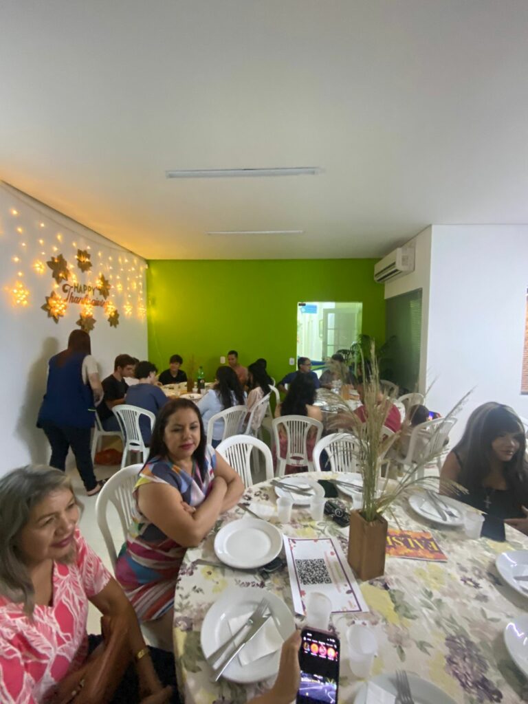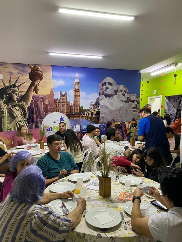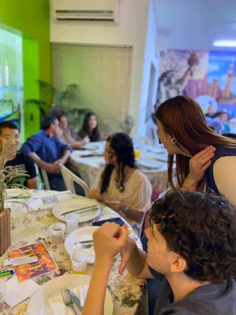 Além do jantar, a noite contou com dinâmicas temáticas desenvolvidas pela equipe da inFlux Dourados, voltadas para interação, prática do inglês e integração entre os participantes. As atividades abordaram curiosidades sobre o Thanksgiving, vocabulário específico, tradições culturais e situações reais que estimulam a conversação em inglês.