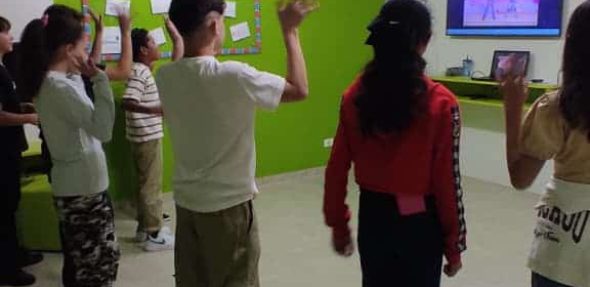 Durante a atividade, os alunos aprenderam chunks em inglês relacionados a movimentos e passos de dança, ampliando o vocabulário de forma prática, contextualizada e dinâmica.