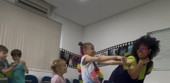 Entre música, movimento e risadas, a diversão tomou conta da sessão, tornando o aprendizado ainda mais envolvente. Experiências como essa mostram que aprender inglês também pode ser dinâmico, descontraído e inesquecível.