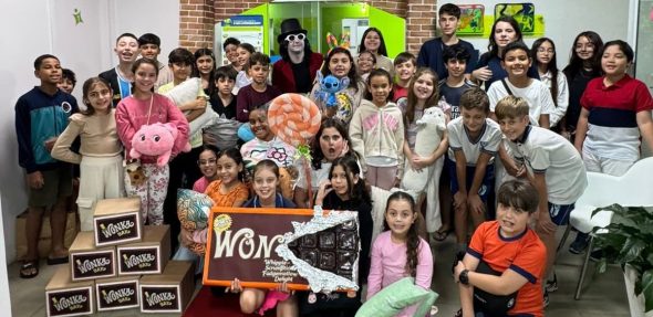 A jornada seguiu com uma sessão especial de Charlie and the Chocolate Factory. Através da prática de chunks em inglês, os alunos vivenciaram a busca pelo convite dourado e a visita à fábrica de chocolate de forma lúdica. A diversão facilita o domínio do idioma.