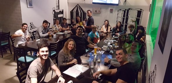 Para encerrar o semestre e comemorar todas as conquistas alcançadas ao longo do curso, preparamos um Happy Hour em um pub aqui de Joinville. Com grande participação de alunos das duas unidades inFlux Joinville, esse encontro foi uma ótima oportunidade para praticar inglês, conhecer pessoas, interagir com outros alunos e professores além de, é claro, tomar aquela cervejinha gelada para refrescar!