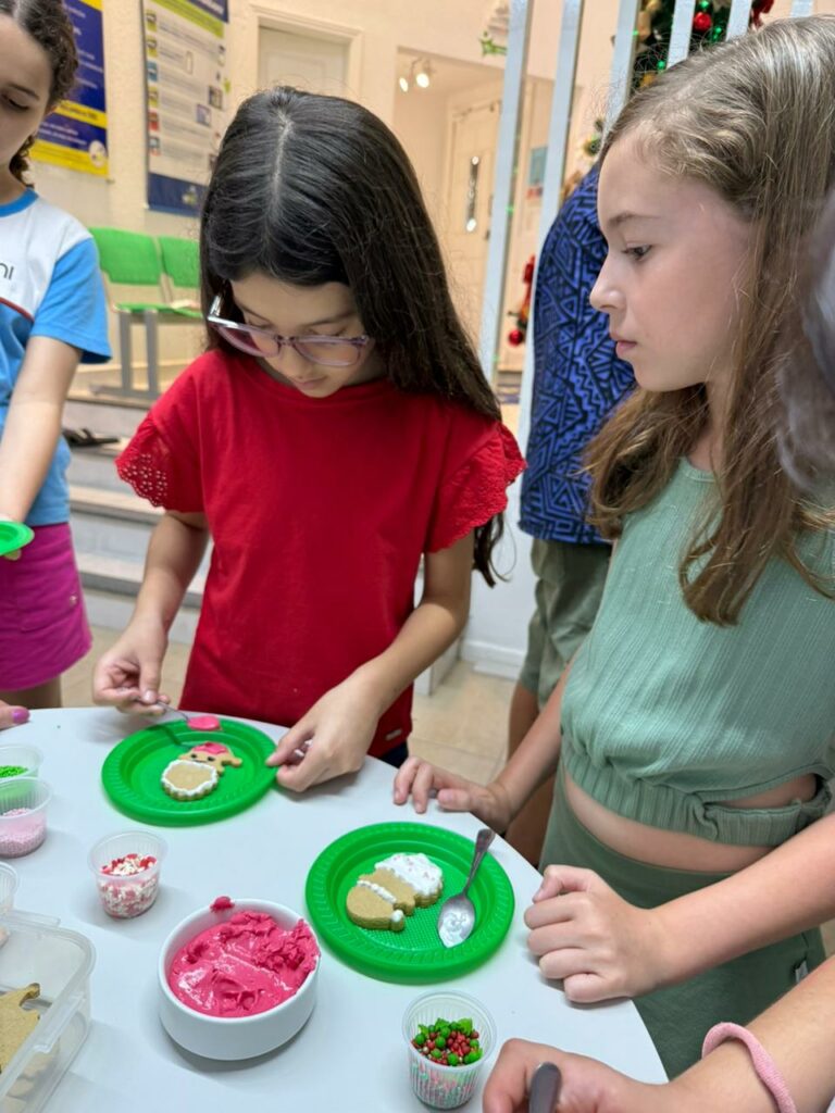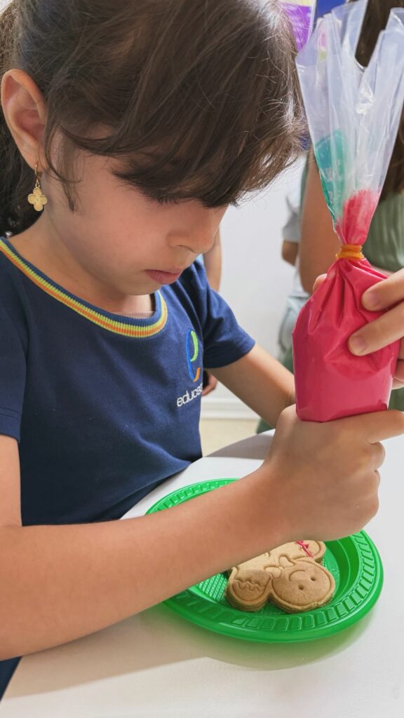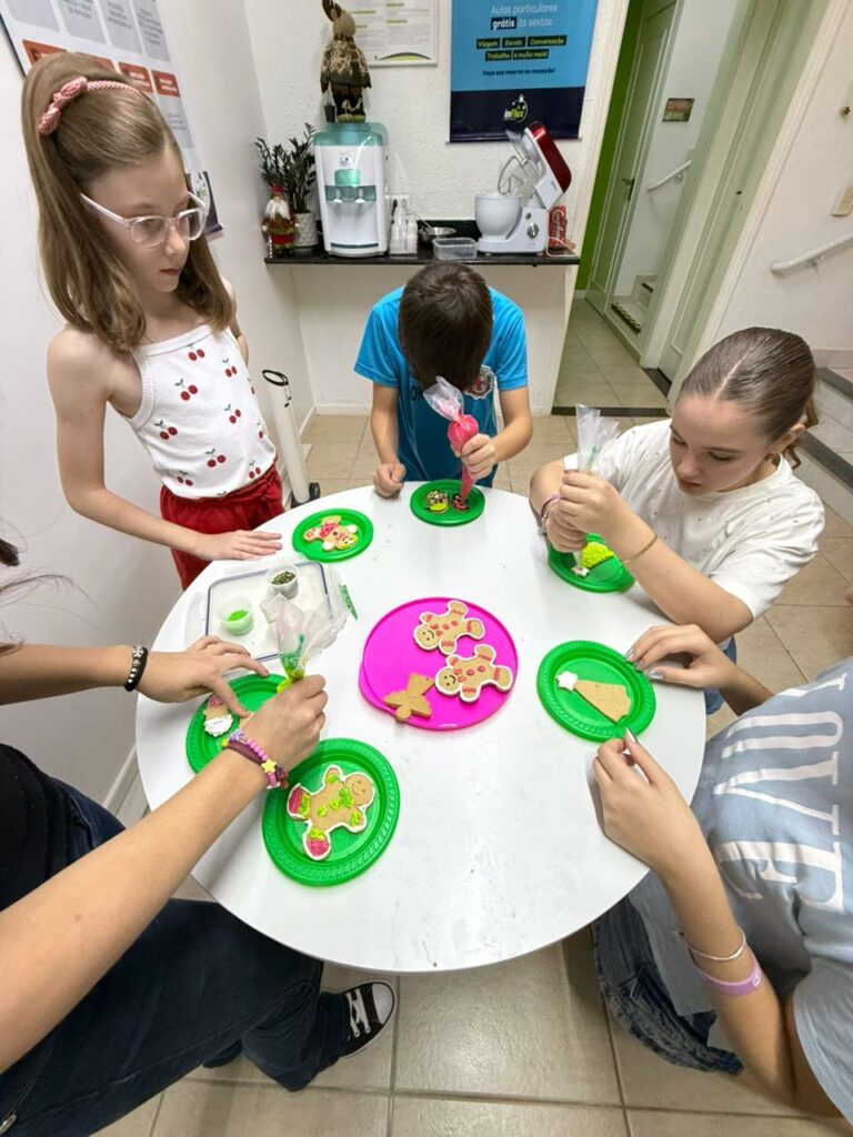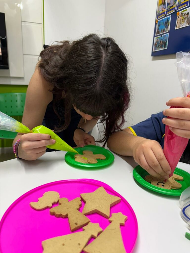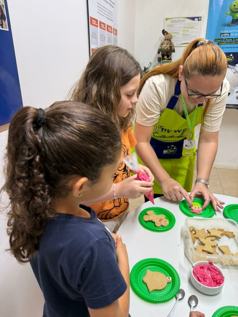 Durante a atividade, os alunos praticaram vocabulário e chunks relacionados à culinária, participaram de um quiz divertido e puderam usar toda a criatividade para decorar suas bolachinhas.