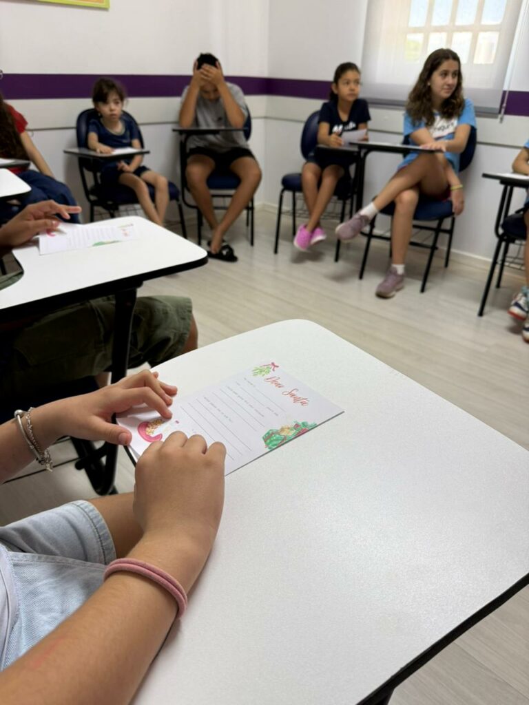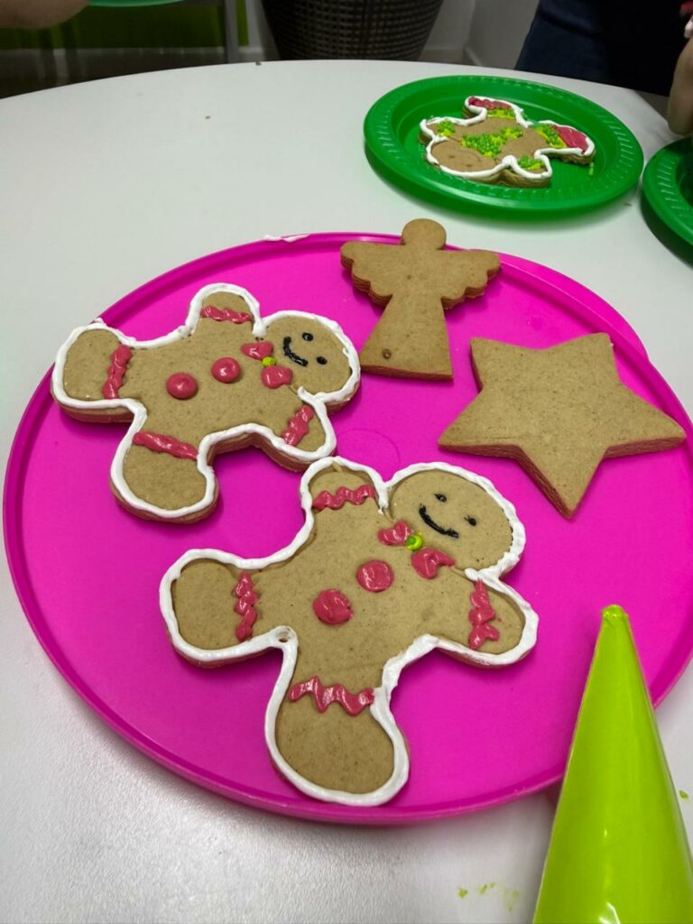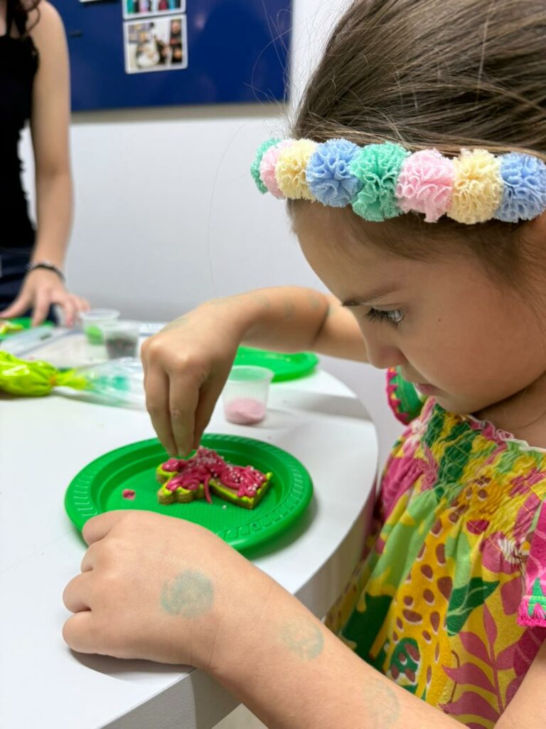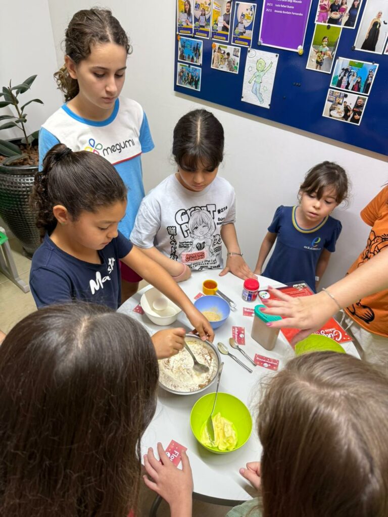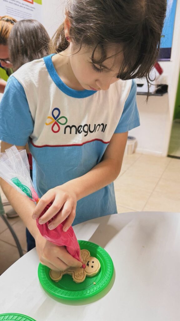 Durante a atividade, os alunos praticaram vocabulário e chunks relacionados à culinária, participaram de um quiz divertido e puderam usar toda a criatividade para decorar suas bolachinhas.