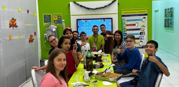 Cada aluno trouxe um prato com a sua identidade, houve um momento para aprender sobre a história do Thanksgiving, revisar diversos chunks e refletir sobre aquilo pelo que cada um é grato.