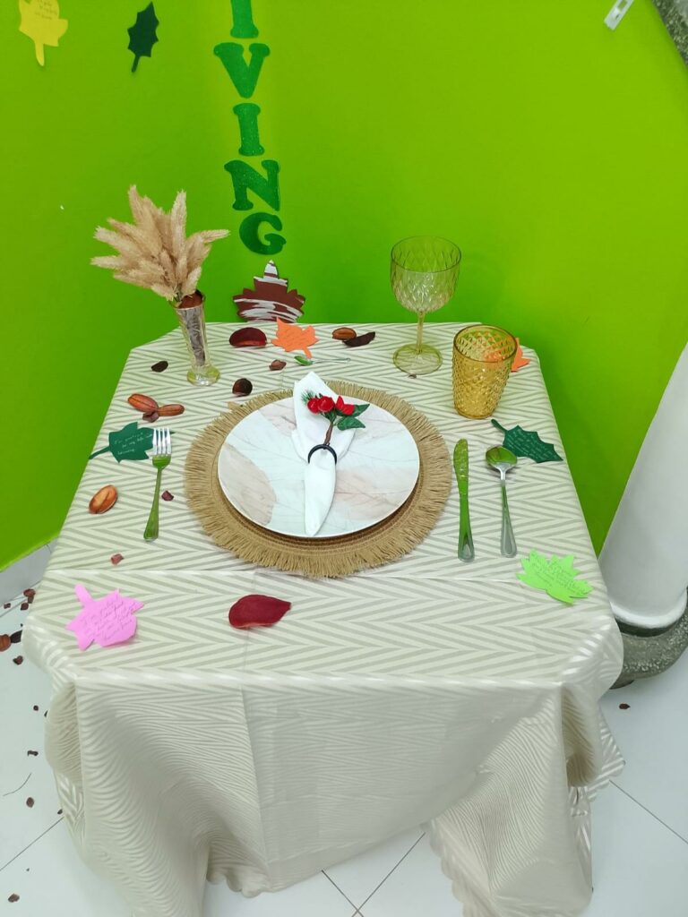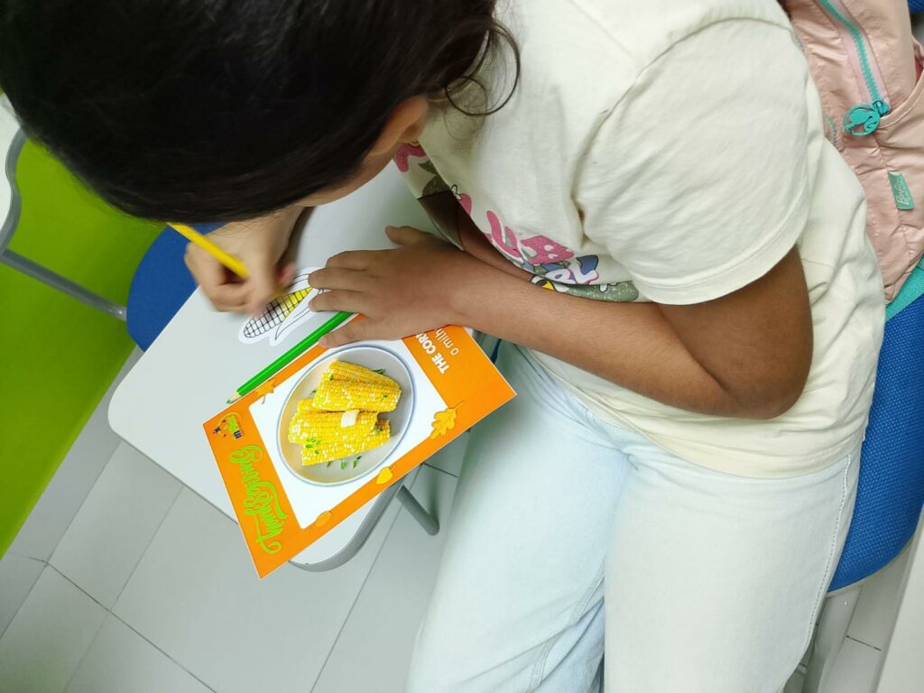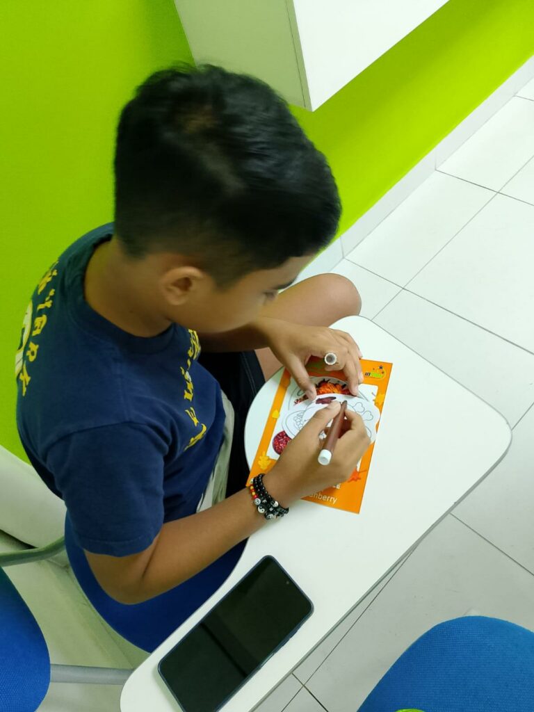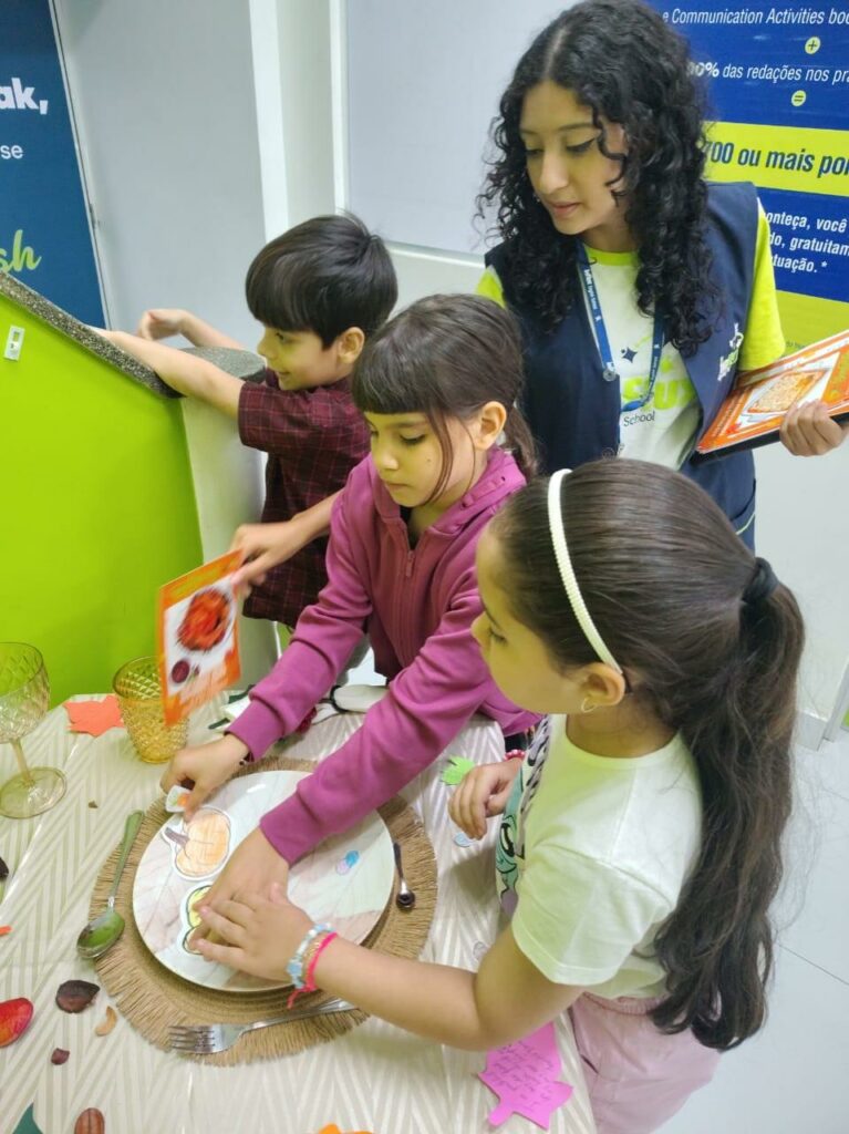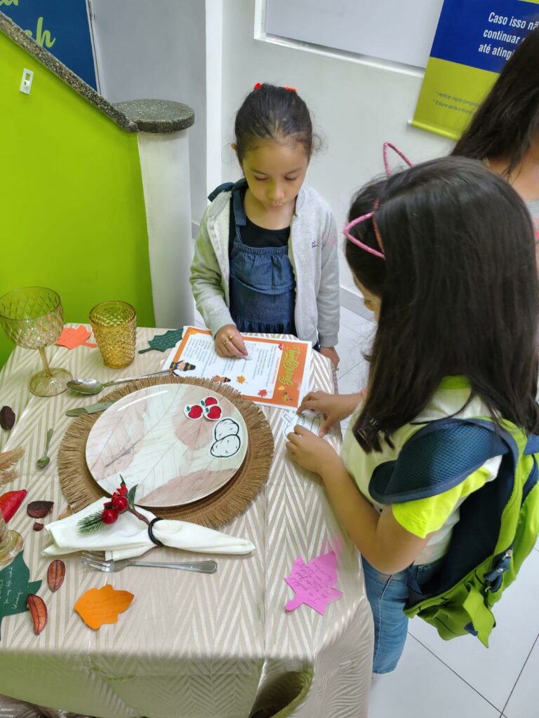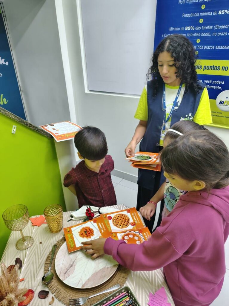 Durante a atividade, as crianças descobriram curiosidades sobre o feriado, aprenderam o nome de pratos típicos e praticaram inglês de forma divertida e leve. Eles montaram uma mesa temática de Thanksgiving, criaram desenhos com refeições tradicionais e exploraram vocabulários relacionados à data.