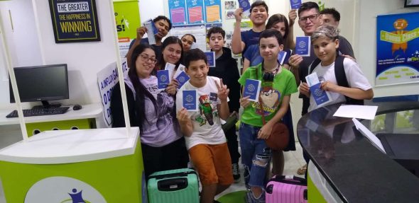 Durante a atividade, eles aprenderam e praticaram chunks essenciais para uma viagem internacional, vivenciando cada etapa da jornada: do aeroporto ao embarque, da apresentação para a Host Family até a busca por informações na cidade.