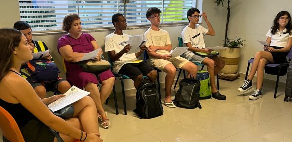 Na atividade, vivenciaram todas as etapas de uma viagem, como check-in no voo, instruções de segurança no avião, imigração, chegada à casa da família anfitriã e passeios pela cidade, pedindo informações e fazendo compras.