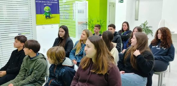 Durante a atividade, os alunos descobriram como aprender vocabulário e gramática de forma prática e eficiente por meio dos chunks, utilizando trechos de produções conhecidas. Eles também participaram de dinâmicas que mostraram como o idioma realmente aparece no dia a dia.