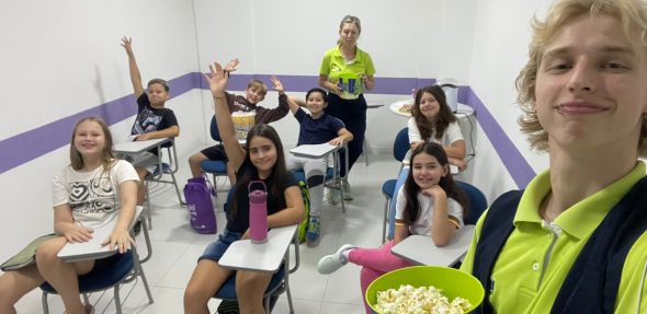 A atividade foi uma oportunidade de praticar o inglês de forma leve e natural, em um ambiente descontraído e imersivo. Para deixar o momento ainda melhor, não faltaram pipoca, salgadinhos, tereré e outras delícias.