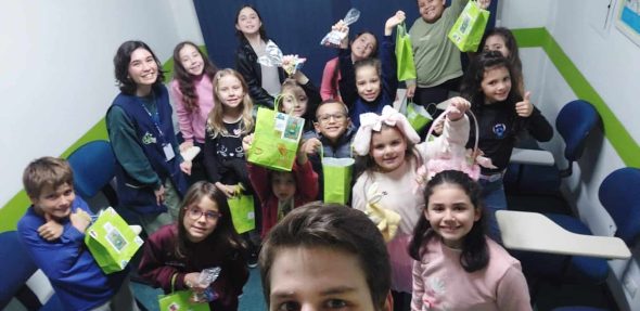 Alunos das turmas Kids e Junior participaram de uma animada Caça aos Doces, onde desbravaram pistas em inglês utilizando chunks, personalizaram suas sacolinhas e praticaram o idioma de forma leve e divertida.