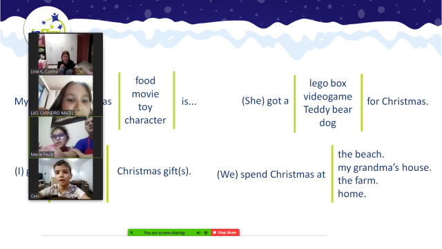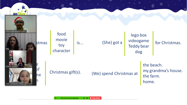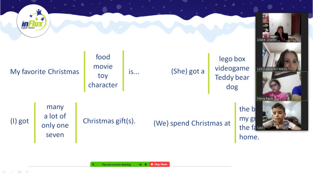 Para entrar no clima dessa comemoração tão esperada, os alunos da inFlux Lapa participaram na sexta-feira, dia 4 de dezembro da atividade extra on-line – Chistmas Games. Além das crianças se divertirem bastante em brincadeiras como ‘The Grinch Among Us’ e ‘Memory Game’, os estudantes também praticaram bastante o inglês aprendido em sala de aula. Confira algumas fotos desta atividade.