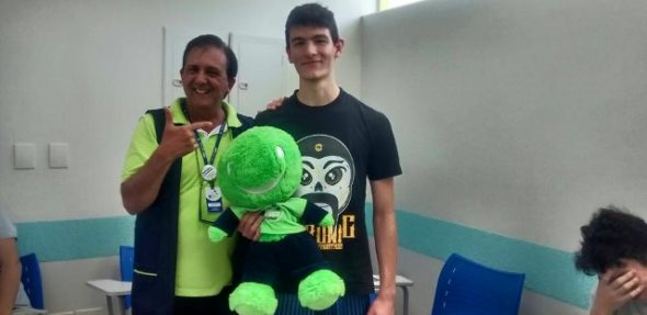 No final, sorteamos o Fluxie entre os participantes e quem levou o Fluxie para a casa foi o aluno Tarik do curso TOEIC.