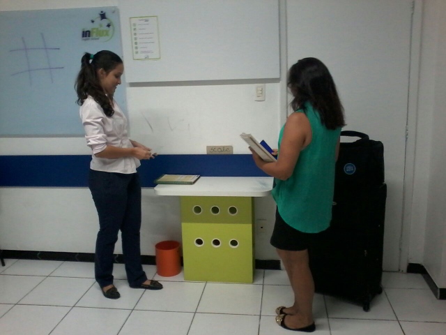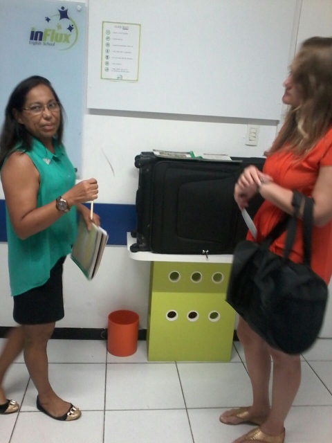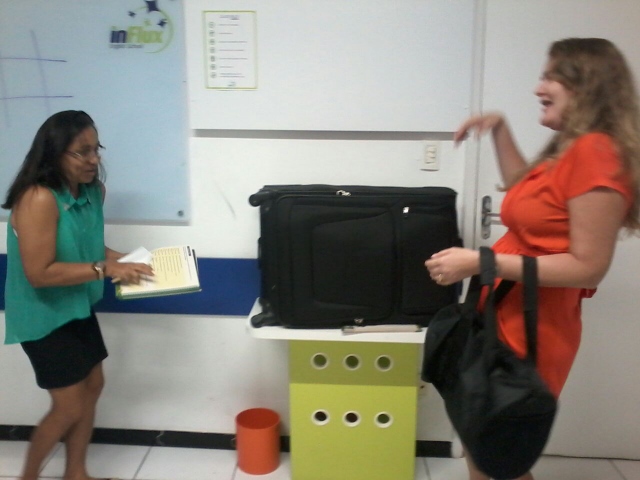 O assunto desta última sexta-feira, 22/04,  foi “Check-in at the Airport” e a teacher Dianna preparou um balcão de check-in dentro de um aeroporto (neste caso a sala do DVD da unidade inFlux) e fez com que os alunos assumissem o papel de passageiro e de agente de aeroporto. Para deixar a experiência mais real as professoras trouxeram até malas!