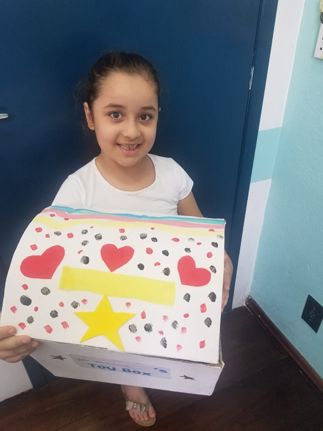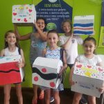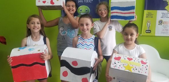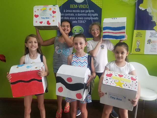 Na última aula de projeto, alunos do curso Kids criaram um Toy Box (caixa de brinquedos). Cada uma delas pintou e decorou a sua caixa de acordo com o seu gosto. Todas as caixas ficaram lindas e maravilhosas! Agora cada uma tem um Toy Box em casa para guardar seus brinquedos.