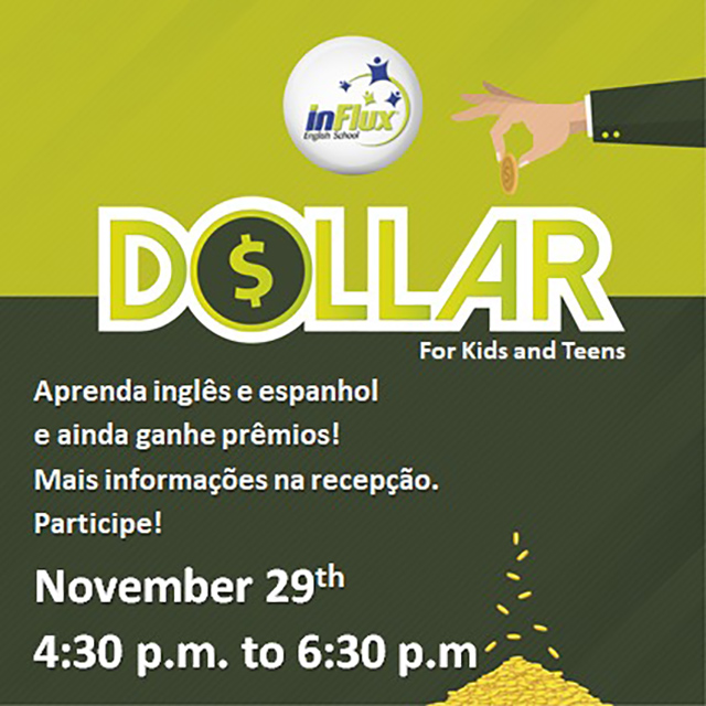 Na inFlux os alunos ganham inFlux Dollars no decorrer do semestre por participar das atividades extras, tarefas feitas no prazo, bom comportamento, notas, etc. No fim do semestre todos podem gastar seus dólares na inFlux Store (lojinha inFlux) e ainda praticar seu inglês!