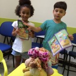 Na aula de 07/04 eles trabalharam com diferentes expressões, por exemplo: “on the table, etc. A teacher levou diferentes bichinhos de pelúcia para trabalhar os conteúdos e aproveitou para ensinar os nomes de alguns desses brinquedinhos fofos. Foi muito legal!