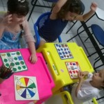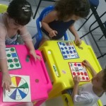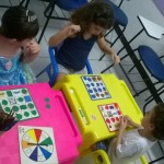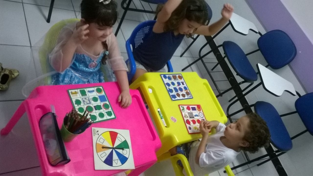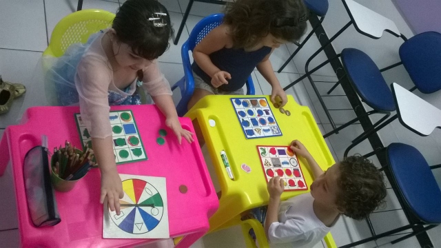 Eles se divertiram muito com tampinhas e cartelas cheias de formas coloridas que a teacher levou pra sala de aula. Quando ela sorteava algum elemento da cartela, os pequenos rapidamente procuravam a forma e a cor!