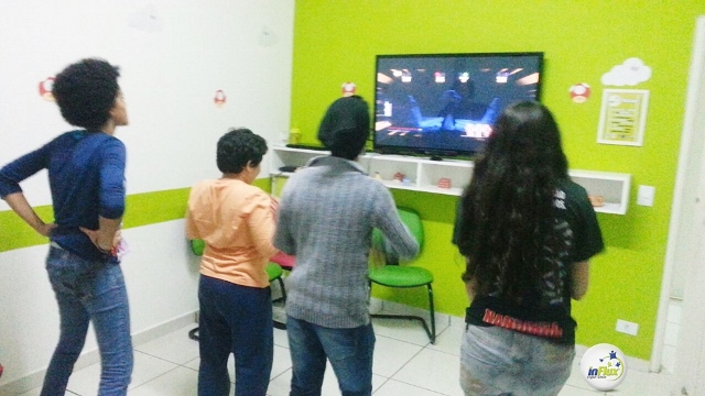 Tivemos vários consoles diferentes de vídeo games, desde o Super Nintendo até o Playstation 4, com jogos clássicos, como Super Mario e Top Gear, bem como alguns atuais, como Just Dance, Guitar Hero e Fifa. Foi uma atividade bem descontraída e divertida.