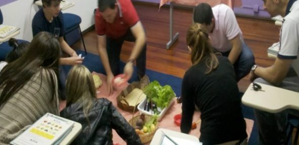 O assunto principal era comida e trouxemos para dentro da sala de aula uma verdadeira feirinha para que os alunos pudessem sentir, na prática, os alimentos, estudar seu nomes e usá-los de forma lúdica durante o seu aprendizado.