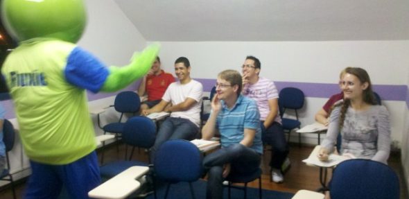 Para animar ainda mais o pessoal o Fluxie mascote resolveu dar uma passadinha nas salas de aula! Ele aproveitou para brincar um pouco com os alunos e deixar todos em ponto de bala para fazer a prova!