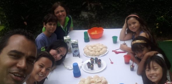 Os meninos trouxeram à escola pratinhos e até salgadinhos para dividir conosco e com os coleguinhas, depois disso, fizeram uma lembrancinha linda! Tudo foi feito em inglês e assim os alunos tiveram chance de pôr em prática tudo o que tem aprendido até o momento.