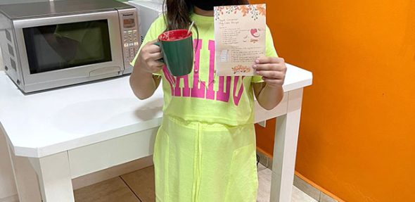 Por último, os alunos fizeram um bolo de caneca seguindo uma receita em inglês. Leram a receita, ingredientes e instruções em inglês para colocarem a mão na massa. Yummy, I think this recipe is mouth-watering (eu acho que esta receita é de dar água na boca).