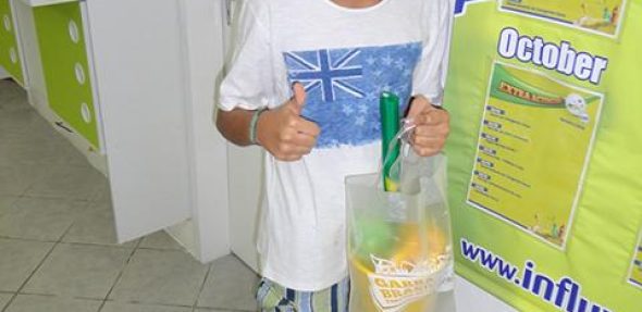 Impressionado com o prêmio, um Kit inFlux, João vestiu logo a camisa e disse que era a primeira vez que ele ganhava um balde com tanta coisa dentro!